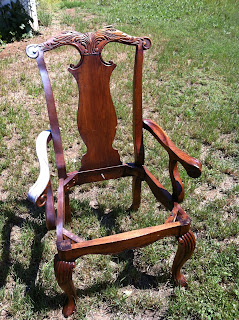 One look at this arm chair and I knew it would be gorgeous all shabby! The carvings at the top of the chair were exquisite and I loved the ribbing down the curve of each leg. It was nice and sturdy and came with a padded seat which I took off in order to shabby. I started priming it and then remembered that I needed to take a 'before' picture -